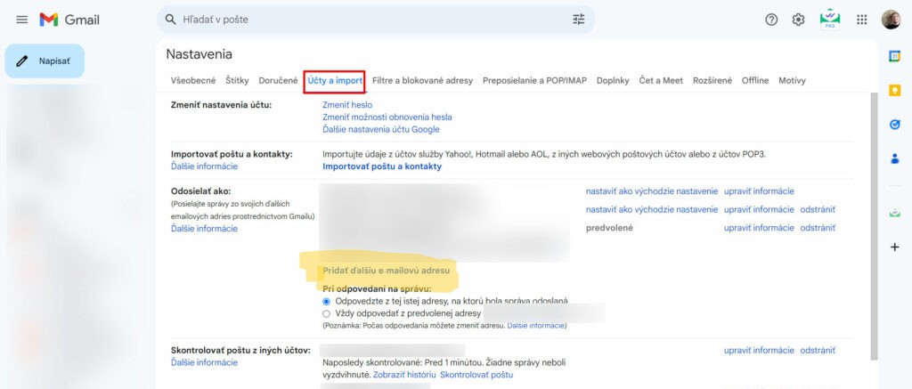 Prejdite na záložku „Účty a import“ a tu máme na výber dve možnosti: Odosielať ako a Skontrolovať poštu z iných účtov. Začneme „Pridať nový e-mailový účet“ v časti Skontrolovať poštu z iných účtov.